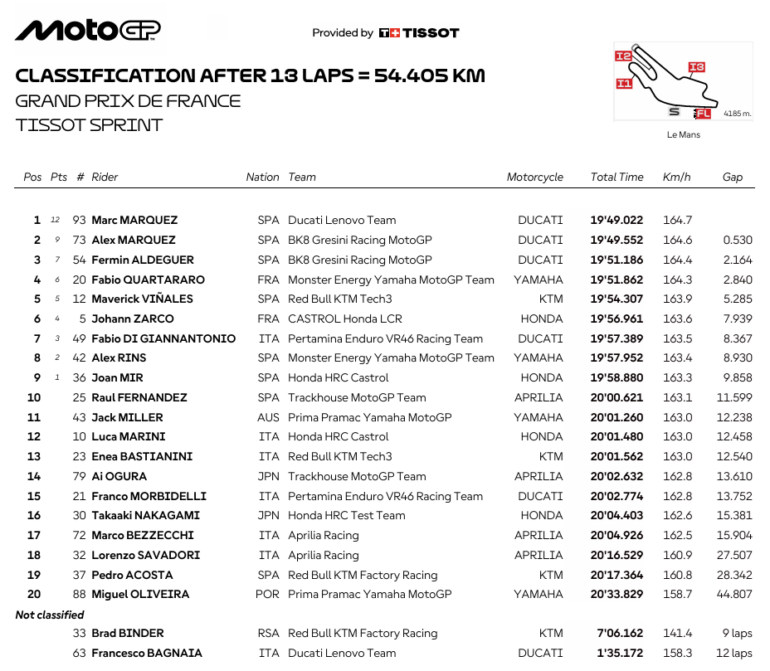 Marc sigue líder del campeonato tras ganar la Sprint y ser segundo en la carrera larga. En un domingo que la lluvia marcó lo que sería una de las finales más inesperadas de los últimos tiempos en MotoGP, ganó Johann Zarco.